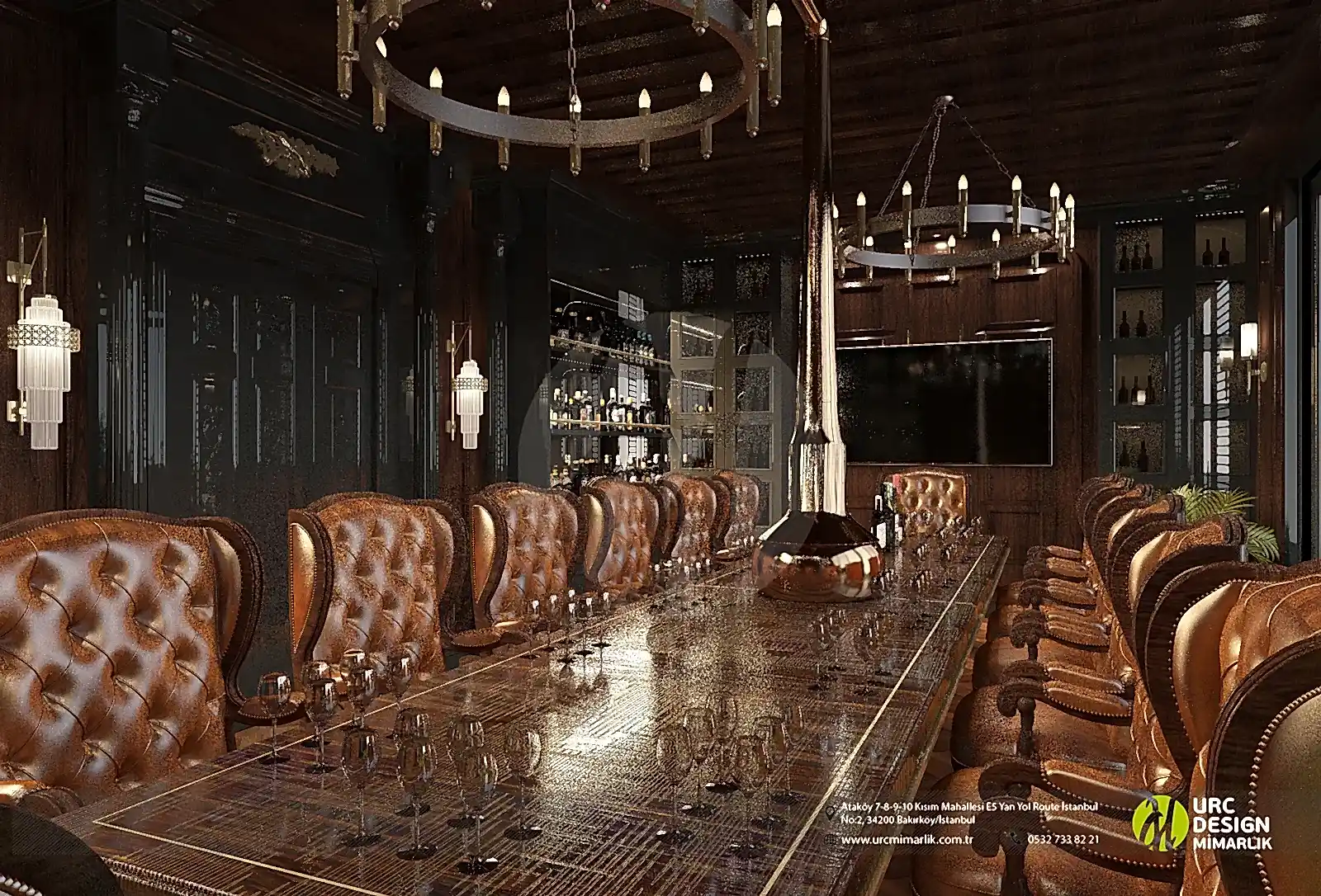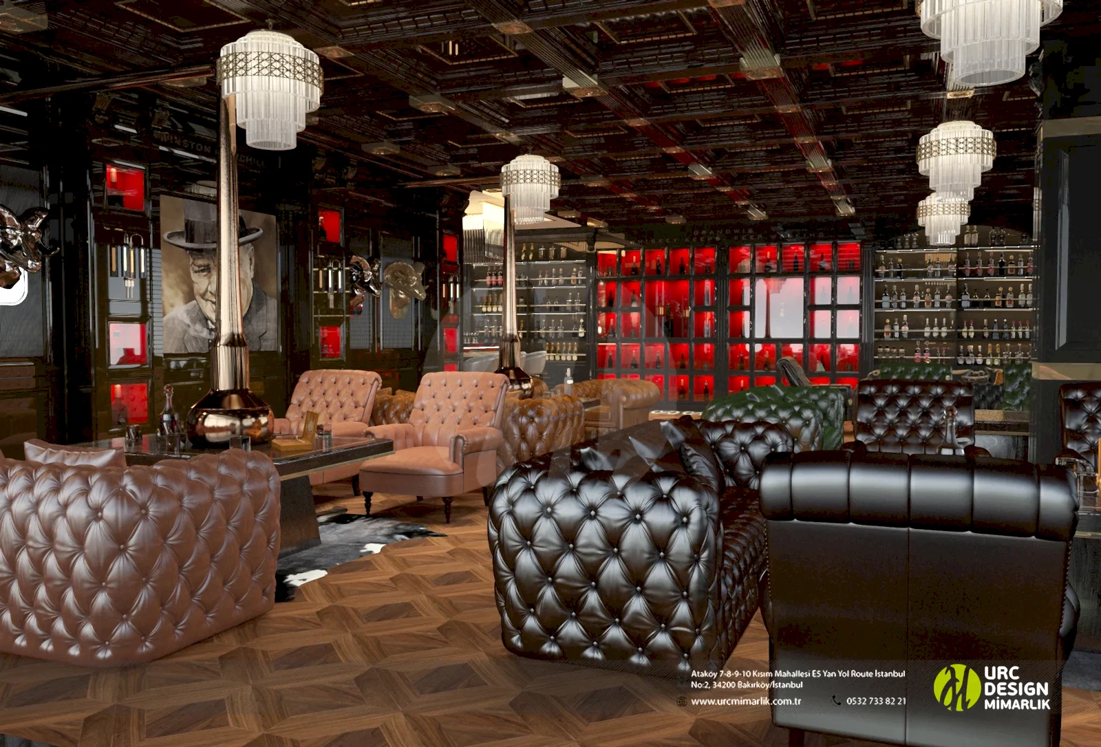 Ayrıca, iç mekan düzenlemesi, oturma gruplarının stratejik konumlandırılması ve yüksek kaliteli malzemelerin kullanımıyla konforu ön planda tutuyor. Bar alanındaki ahşap detaylar ve metal aksesuarlar, modern bir endüstriyel dokunuş eklerken, geniş ve ferah mekan düzeni, konukların rahatça dolaşmasını sağlıyor. Whiskey Lounge'un iç mekan tasarımı, konuklarına unutulmaz bir atmosferde, kaliteli zaman geçirme imkanı sunarak, keyifli anılar biriktirmelerine olanak tanıyor.