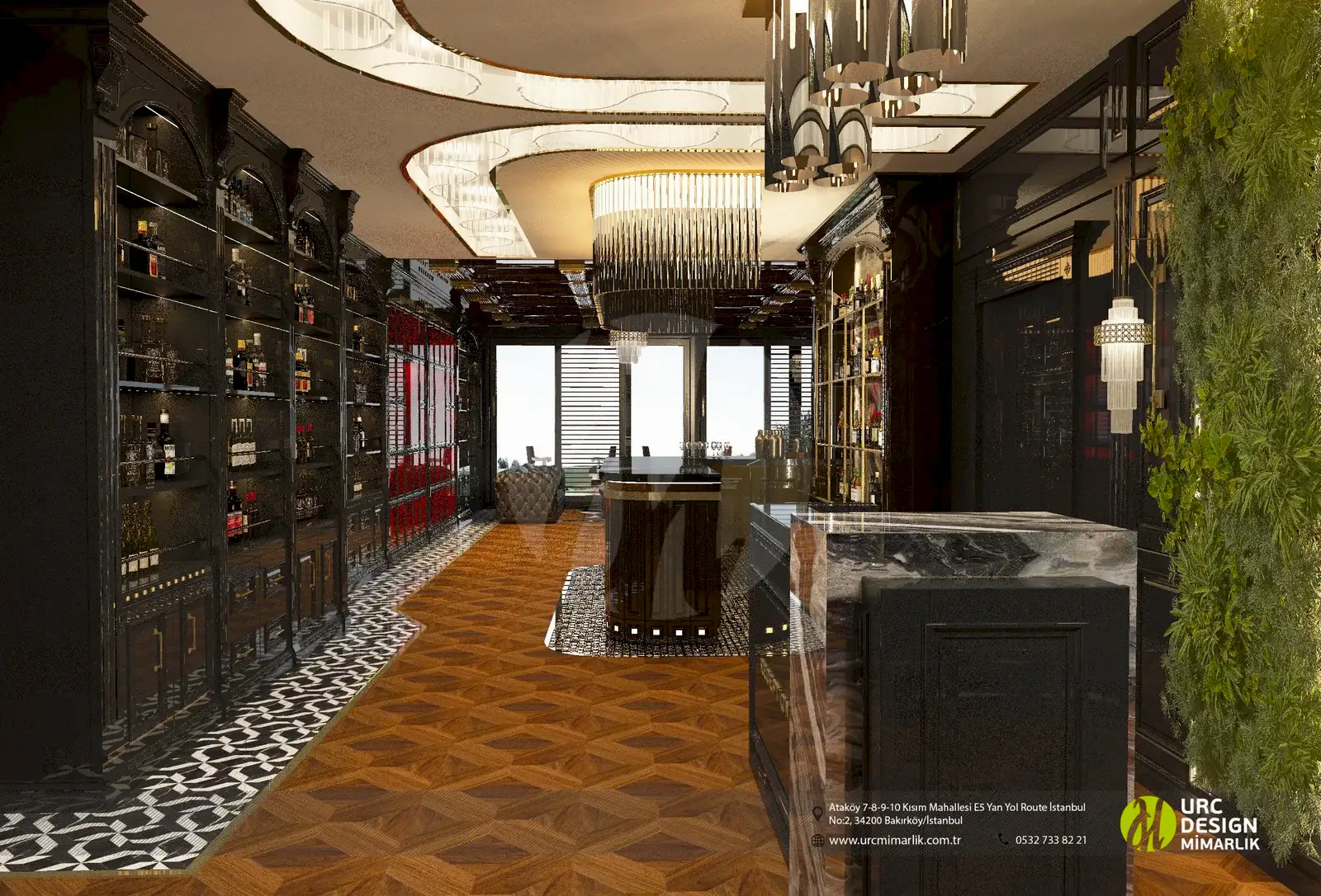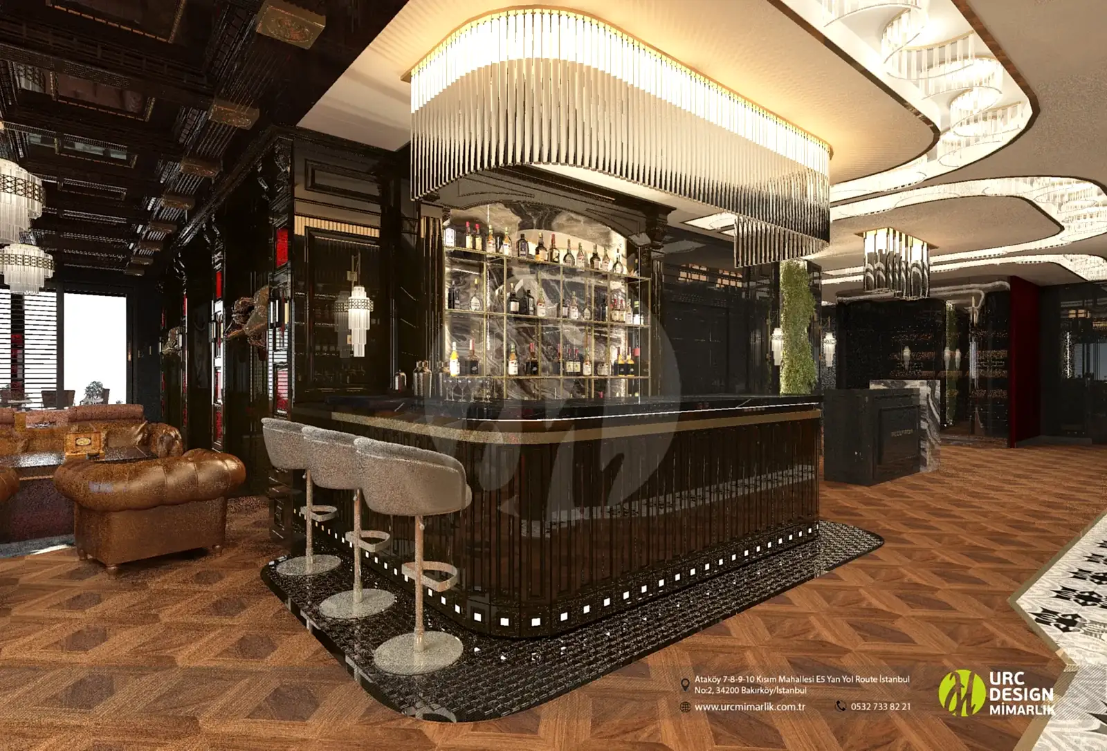 Bar tasarımı, modern ve şık çizgilerle donatılmış, konukların keyifli bir içki deneyimi yaşayabileceği özel bir alanı temsil eder.